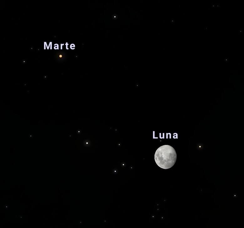La Luna será guía hacia el planeta rojo. En su fase de gibosa creciente, que es la transición entre cuarto creciente y luna llena, mostrará el 90% de su cara iluminada. Asomará por el este un poco antes del atardecer y será la referencia para encontrar, a unas siete lunas llenas de distancia, a Marte. Si la Luna estuviese en el centro de un reloj analógico, el planeta estaría a las 10 horas, a la izquierda y un poco arriba. Apenas perceptible al atardecer, aumentará su brillo durante el ocaso y será un placentero desafío visual descubrirlo en la transición del día a la noche.