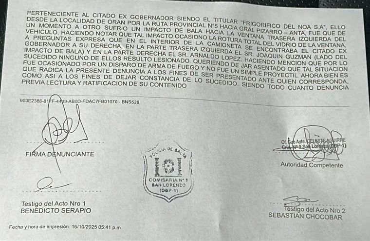 Según detallaron en la denuncia radicada en la Comisaría N.° 101 de San Lorenzo, mientras el chofer y secretario de Urtubey, Carlos María García Bes, conducía, escuchó un estruendo e inmediatamente vio el impacto en la ventana trasera izquierda.