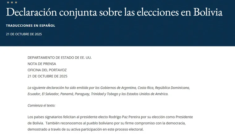 Argentina mantuvo su posición geopolítica con Estados Unidos y firmó un documento del Departamento de Estado del país norteamericano donde expresa su apoyo al nuevo presidente boliviano Rodrigo Paz, que se impuso este domingo en las elecciones. El Gobierno se acopló a otros siete países de la región: Costa Rica, Ecuador, El Salvador, Panamá, Paraguay, República Dominicana y Trinidad y Tobago.