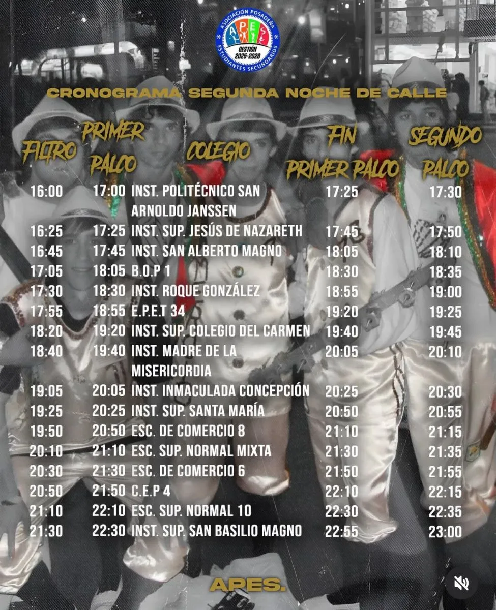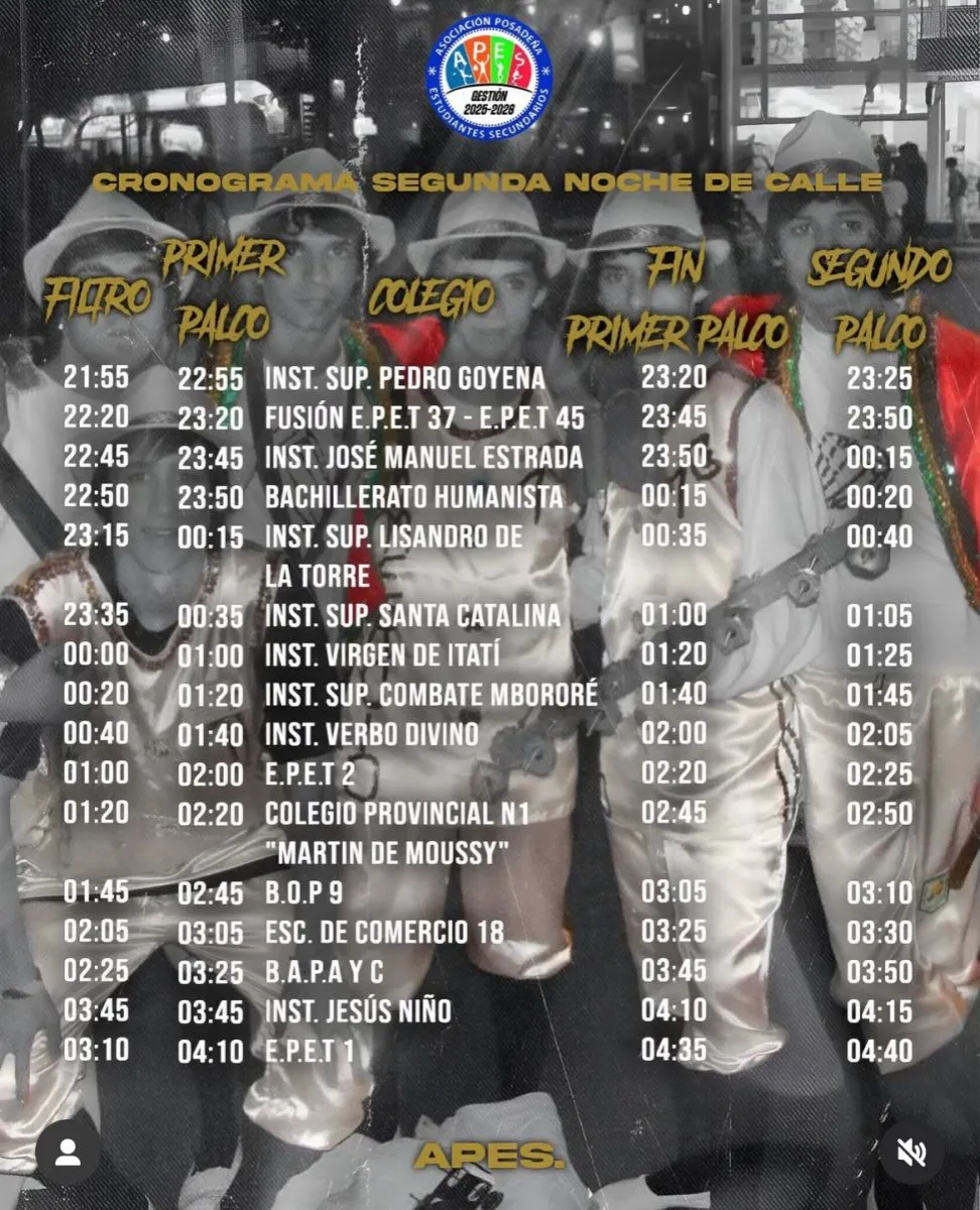 Debido a las reprogramaciones, será una noche clave en el calendario de la fiesta estudiantil más esperada. Desde Apes compartieron el cronograma oficial: