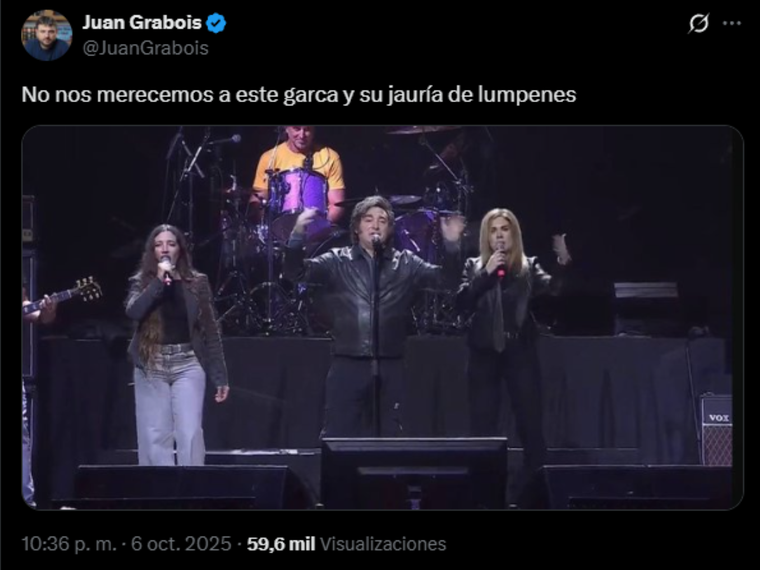 En sintonía con lo expresado por el gobernador bonaerense, una catarata de dirigentes opositores salió a expresarse contra el show que montó el libertario en el Movistar Arena. Juan Grabois fue uno de los candidatos que escribió afilado en su cuenta de X: “No nos merecemos a este garca y su jauría de lúmpenes”.