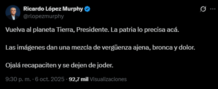 Por fuera del peronismo, el legislador Ricardo López Murphy disparó: “Vuelva al planeta Tierra, Presidente. La patria lo precisa acá. Las imágenes dan una mezcla de vergüenza ajena, bronca y dolor”, y sentenció: “Ojalá recapaciten y se dejen de joder”.