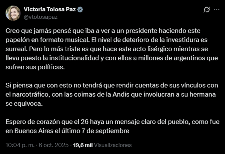 También se sumó la diputada peronista Victoria Tolosa Paz, quien se descargó fuertemente: “Creo que jamás pensé que iba a ver a un presidente haciendo este papelón en formato musical. El nivel de deterioro de la investidura es surreal. Pero lo más triste es que hace este acto lisérgico mientras se lleva puesto la institucionalidad y con ellos a millones de argentinos que sufren sus políticas”, insistió.
