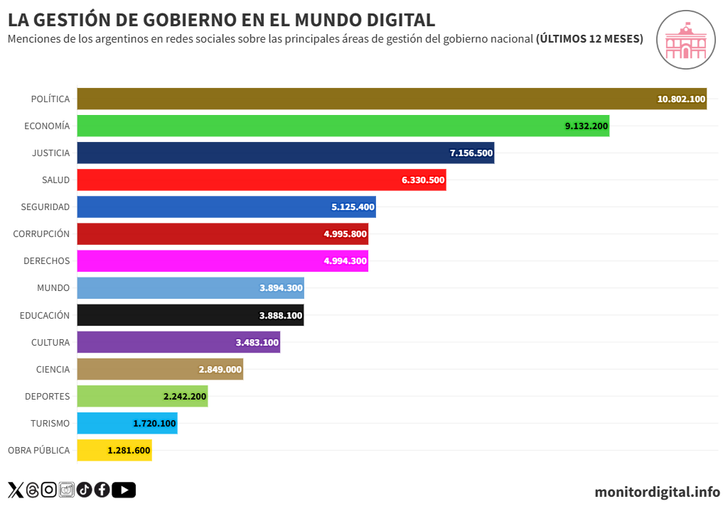 Con más de 7,1 millones de menciones en redes sociales en los últimos 12 meses, la Justicia integra el podio de las áreas de gestión del gobierno más discutidas por los argentinos, solo detrás de Política (10,8M) y Economía (9,1M).