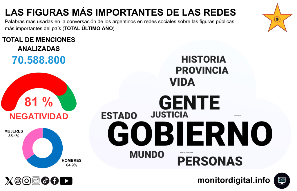 En los últimos 12 meses se registraron 70.588.800 de menciones sobre figuras públicas, con 81% de negatividad y una conversación más masculinizada (64,9% hombres vs 35,1% mujeres).