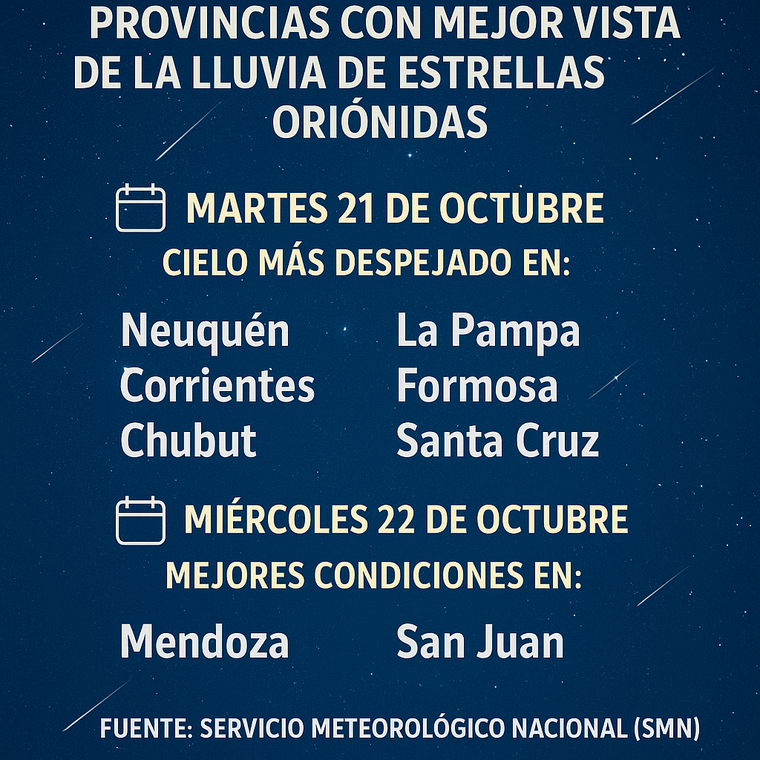 De acuerdo con el Servicio Meteorológico Nacional (SMN), la noche del 21 y madrugada del 22 de octubre presentarán nubosidad y tormentas en buena parte del país, lo que podría dificultar la observación del fenómeno. Sin embargo, las condiciones más favorables se concentrarán en Neuquén, La Pampa, Corrientes, Formosa, Chubut y Santa Cruz, donde se espera cielo más despejado y mejor visibilidad para disfrutar la lluvia de estrellas. Para la noche del 22 de octubre las provincias que mejores condiciones presentarán son Mendoza y San Juan.
