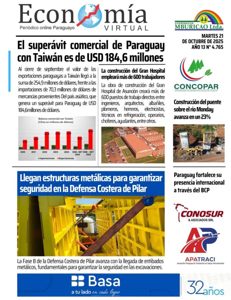 El periódico Economía Virtual dedicó su tapa de este martes al sólido desempeño del comercio bilateral entre Paraguay y Taiwán, que al cierre de septiembre registra un superávit de USD 184,6 millones a favor del país sudamericano.