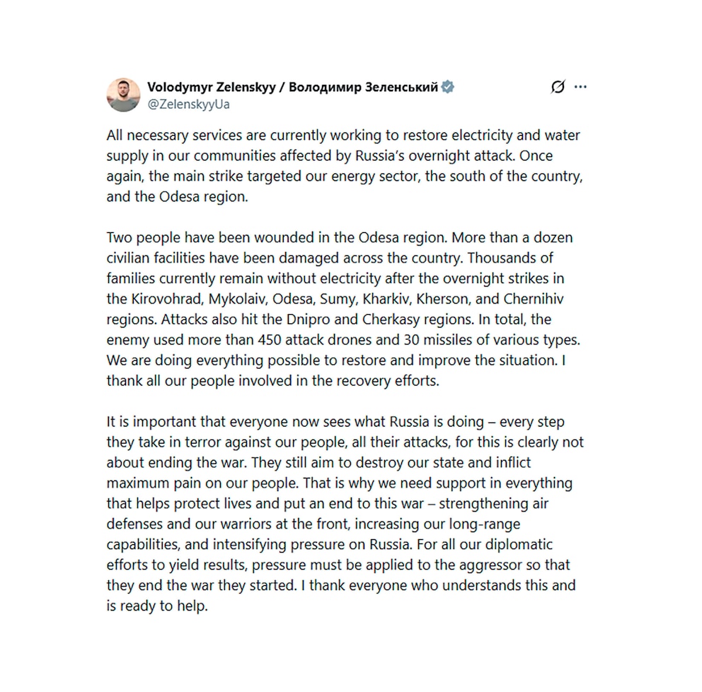 El presidente ucraniano, Volodimir Zelensky, denunció en sus redes sociales que los ataques rusos dañaron más de una docena de instalaciones civiles en siete regiones del país, dejando a miles de ciudadanos sin suministro eléctrico. “Es importante que todos vean lo que Rusia está haciendo… esto claramente no es para terminar la guerra. Siguen buscando destruir nuestro Estado e infligir el máximo dolor a nuestra gente”, expresó Zelensky, resaltando el impacto sobre la población civil.